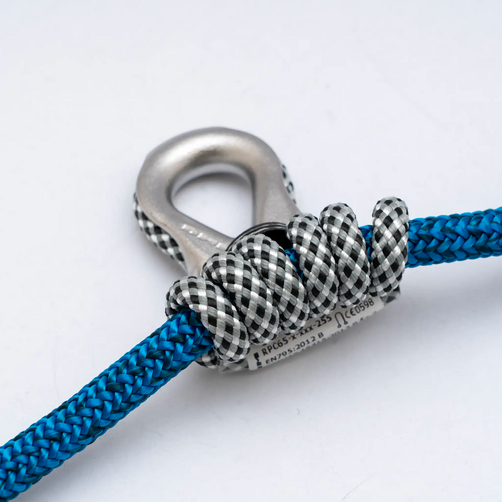• Single, using thimble hitch. Significantly increases the working length of the lanyard and reduces clutter close to the harness.